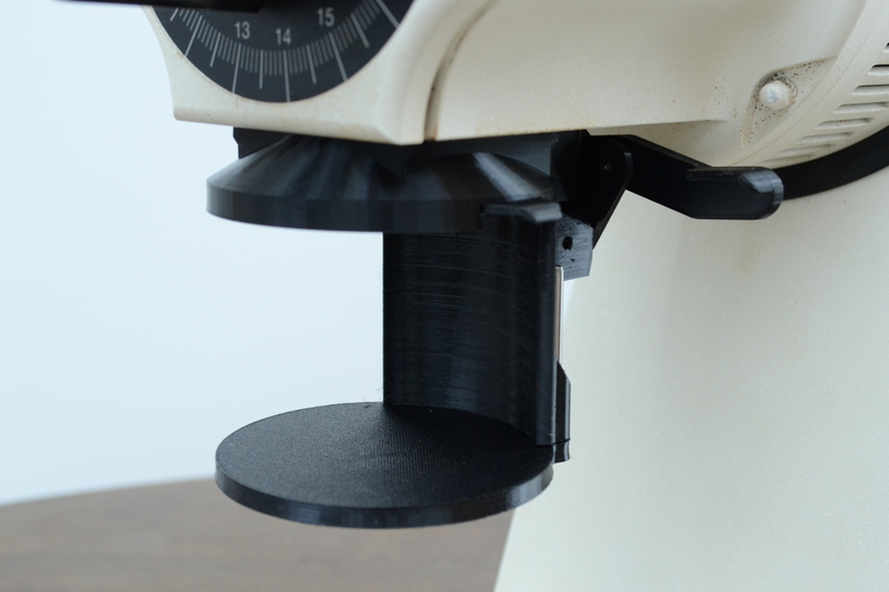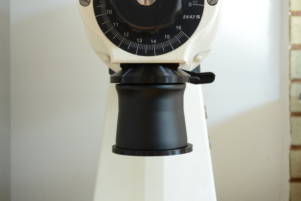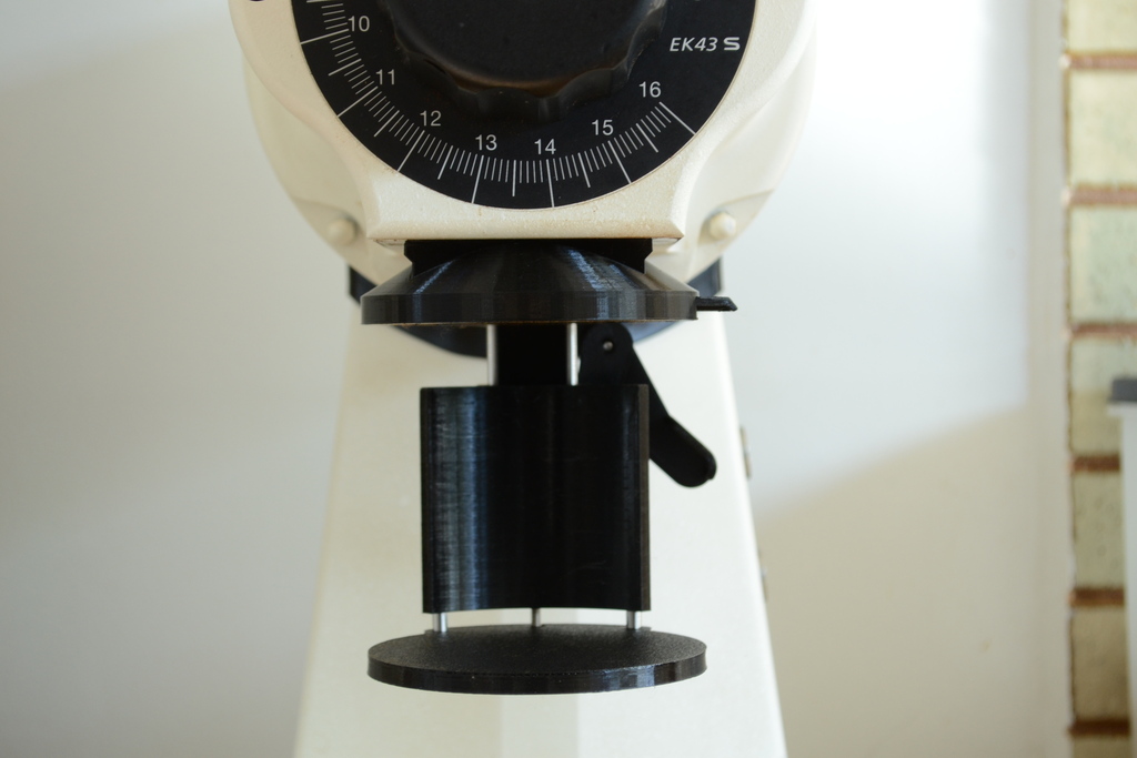 Our dosing cup holder with knocker solves this with height adjustable lever actuated platform so you can easily place and remove your dosing cup. Designed with an in built easy access knocker, you can easily get the last few 0.1g of coffee in the EK43 exit chute.